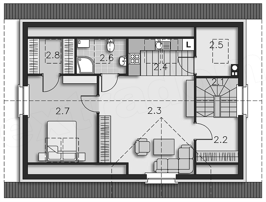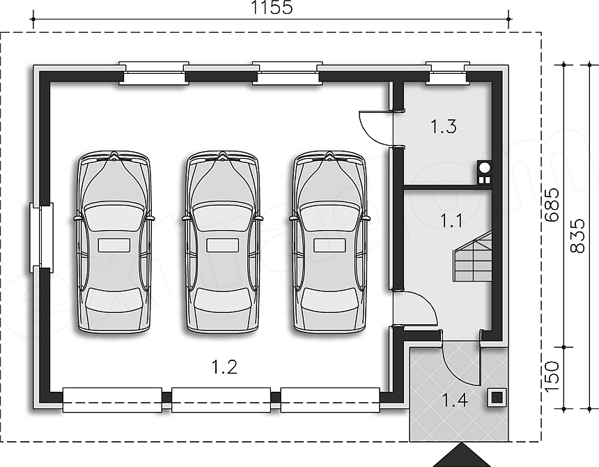 Ciekawa propozycja budynku garażowego na trzy stanowiska, z wydzieloną częścią mieszkalną na poddaszu. W strefie tej znajduje się salon z garderobą i aneksem kuchennym, sypialnia z garderobą, łazienka i pomieszczenie gospodarcze. Przestrzeń tę, w razie potrzeby można zaadaptować jako pomieszczenia usługowe lub biurowe.