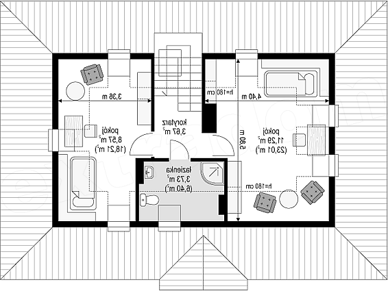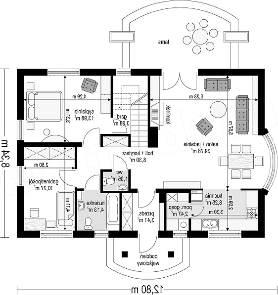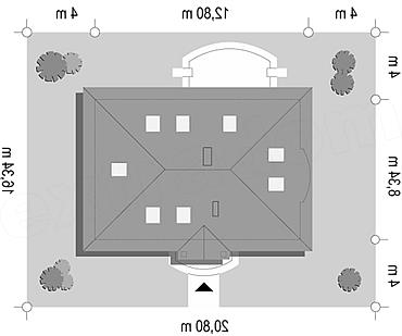 Projekt domu Gargamel to dom jednorodzinny nawiązujący do formy i stylistyki dworku polskiego. Wewnątrz kryje nowoczesny układ wnętrz dla 4-5cio osobowej rodziny. Budynek posiada czterospadowy dach, front wejściowy z kolumnami czy cokół z boniowaniem rozszerzającym się ku dołowi nadają bryle powagi i solidności. Wnętrze domu Gargamel tworzą wygodny salon z wyjściem na taras, aneks jadalny z pięknym łukowym wykuszem, częściowo otwarta kuchnia z bardzo przydatnym pomieszczeniem gospodarczym, oraz w drugim skrzydle domu dwa pokoje z łazienką i garderobą. Na poddaszu dwie sypialnie z łazienką. Poddasze można wykończyć w drugim etapie budowy. Dom Gargamel dostępny jest w odbiciu lustrzanym.