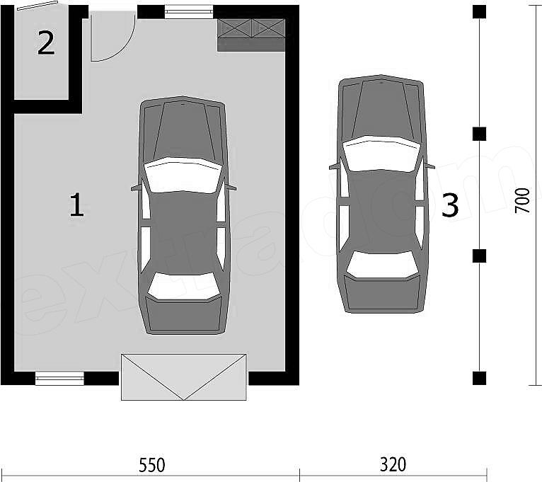 Garaż jednostanowiskowy dostawiany z pomieszczeniem gospodarczym i wiatą.