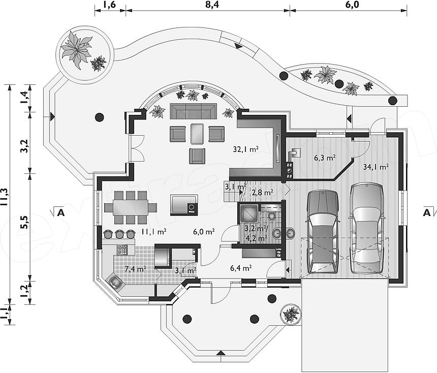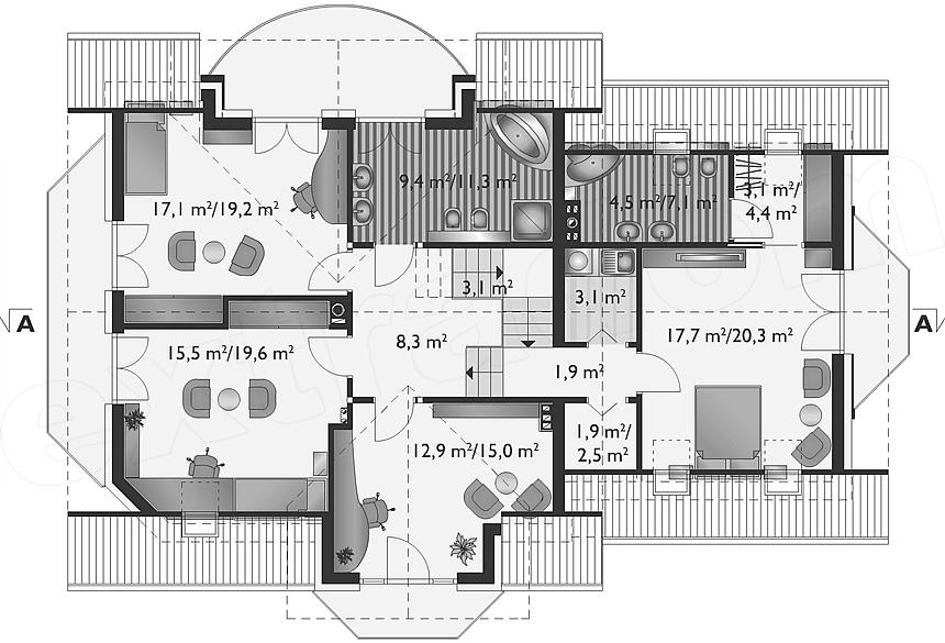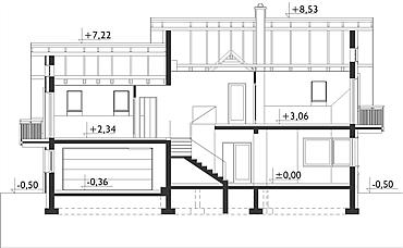 Projekty domów parterowych z użytkowym poddaszem, w których tak, jak w Heliotropie postawiliśmy na rozmach formy i niestandardową wielkość, zgrupowane zostały w kolekcji mini-rezydencji Archetonu. Na rozbudowanym rzucie Heliotropa umieszczono strefę mieszkalną i dostępną z holu część gospodarczą. Dwustanowiskowy garaż sąsiaduje tu z dużą kotłownią i umożliwia przejście na tyły posesji. Otwarty parter dzieli jedynie centralnie usytuowany kominek. Na poddaszu są trzy pokoje, łazienka oraz na osobnym poziomie nad garażem, komfortowy zespół głównej sypialni. Sylwetę budynku cieniują balkony i wnęki wsparte na słupach, ale szczególną uwagę przykuwają ciekawe przeszklenia. Projekt Heliotrop ma mniejszą powierzchnię użytkową niż projekt Heliotrop Max. Wynika to głównie z różnicy materiałów ściennych i detalu wnęki balkonu w elewacji ogrodowej. Kształt i położenie klatki schodowej skutkuje innym układem salonu, łazienki na parterze, przejścia do garażu i kotłowni. Użytkowe poddasze w projekcie Heliotrop proponuje o jedną mniej sypialnię na użytkowym poddaszu, ale w zamian – większe pomieszczenie pralni.
