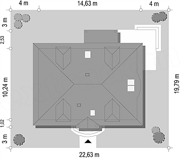 Pow. zabudowy 146,11 m2 Min. szer. działki 22,63 m Kąt nach. dachu 38 st