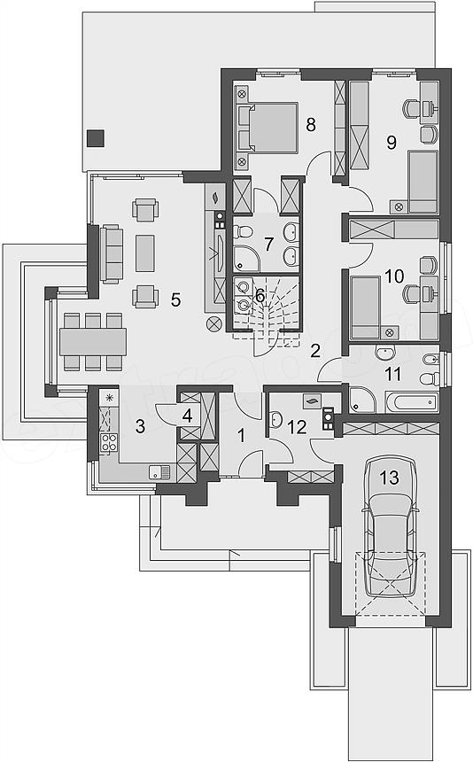 Projekt zgodny z wymaganiami WT2021. Hipokrates to wygodny dom parterowy, idealny dla 4-osobowej rodziny. Wyważonej i przyjemnej w odbiorze bryle budynku nowoczesności i charakteru dodają narożne okna i drewniana okładzina na elewacji. Zaprojektowany został zgodnie z zasadą podziału na trzy strefy: dzienną, nocną oraz pomocniczą. Trzon tej pierwszej stanowi salon z kominkiem oraz bezpośrednim wyjściem na zadaszony taras. Salon ten płynnie przechodzi w przestrzeń jadalnianą, częściowo ograniczoną przeszklonym wykuszem, która to z kolei graniczy z kuchnią wyposażoną w spiżarnię. Założona jako otwarta, kuchnia może być, po dostawieniu ścianki działowej, przekształcona w zamkniętą. Natomiast decydując się na rezygnację ze spiżarni, zyskujemy dodatkową przestrzeń na szafy w wiatrołapie, powiększając jednocześnie powierzchnię kuchni. Strefa nocna to trzy sypialnie. Dwie z nich posiadają bezpośrednie wyjście na taras, a jedna dodatkowo indywidualną garderobę oraz łazienkę. Wchodzimy do domu mijając podcień, skutecznie chroniący przed deszczem oraz wiatrołap z dostępem do kotłowni, stanowiącej niejako bufor między częścią mieszkalną a garażem. W strefie wejściowej usytuowane jest pomieszczenie, któremu można przyporządkować, w zależności od potrzeb, różne funkcje: garderoby, sauny czy pomieszczenia gospodarczego. Może także stanowić przestrzeń dla schodów prowadzących na poddasze, które to można zaadaptować na dodatkową powierzchnię mieszkalną. Projekt w standardzie posiada dodatkowo projekt ogrzewania kominkiem z płaszczem wodnym. Wizualizacja jest propozycją tego jak dany projekt domu oraz jego otoczenie można zaaranżować. Sposób prowadzenia tarasu, kształt murków i elementy małej architektury typu pergole, donice itp. nie są objęte zakresem projektu. W związku z powyższym na projekcie budowlanym elementy te mogą nie być uwzględnione w projekcie ( patrz pergole ) lub zmieniony może być ich kształt i sposób prowadzenia ( wielkości tarasów, profil murków ).