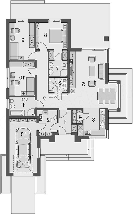 Projekt zgodny z wymaganiami WT2021. Hipokrates to wygodny dom parterowy, idealny dla 4-osobowej rodziny. Wyważonej i przyjemnej w odbiorze bryle budynku nowoczesności i charakteru dodają narożne okna i drewniana okładzina na elewacji. Zaprojektowany został zgodnie z zasadą podziału na trzy strefy: dzienną, nocną oraz pomocniczą. Trzon tej pierwszej stanowi salon z kominkiem oraz bezpośrednim wyjściem na zadaszony taras. Salon ten płynnie przechodzi w przestrzeń jadalnianą, częściowo ograniczoną przeszklonym wykuszem, która to z kolei graniczy z kuchnią wyposażoną w spiżarnię. Założona jako otwarta, kuchnia może być, po dostawieniu ścianki działowej, przekształcona w zamkniętą. Natomiast decydując się na rezygnację ze spiżarni, zyskujemy dodatkową przestrzeń na szafy w wiatrołapie, powiększając jednocześnie powierzchnię kuchni. Strefa nocna to trzy sypialnie. Dwie z nich posiadają bezpośrednie wyjście na taras, a jedna dodatkowo indywidualną garderobę oraz łazienkę. Wchodzimy do domu mijając podcień, skutecznie chroniący przed deszczem oraz wiatrołap z dostępem do kotłowni, stanowiącej niejako bufor między częścią mieszkalną a garażem. W strefie wejściowej usytuowane jest pomieszczenie, któremu można przyporządkować, w zależności od potrzeb, różne funkcje: garderoby, sauny czy pomieszczenia gospodarczego. Może także stanowić przestrzeń dla schodów prowadzących na poddasze, które to można zaadaptować na dodatkową powierzchnię mieszkalną. Projekt w standardzie posiada dodatkowo projekt ogrzewania kominkiem z płaszczem wodnym. Wizualizacja jest propozycją tego jak dany projekt domu oraz jego otoczenie można zaaranżować. Sposób prowadzenia tarasu, kształt murków i elementy małej architektury typu pergole, donice itp. nie są objęte zakresem projektu. W związku z powyższym na projekcie budowlanym elementy te mogą nie być uwzględnione w projekcie ( patrz pergole ) lub zmieniony może być ich kształt i sposób prowadzenia ( wielkości tarasów, profil murków ).