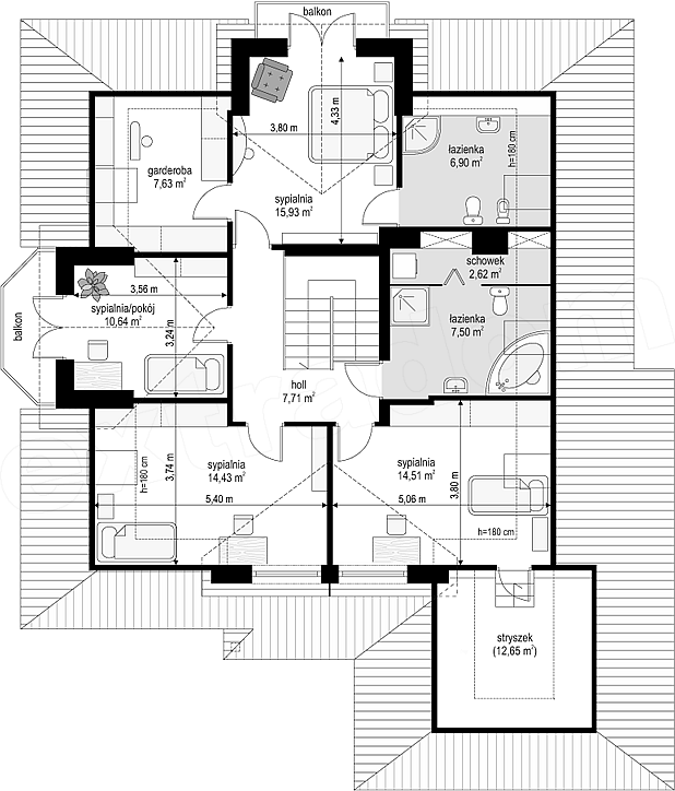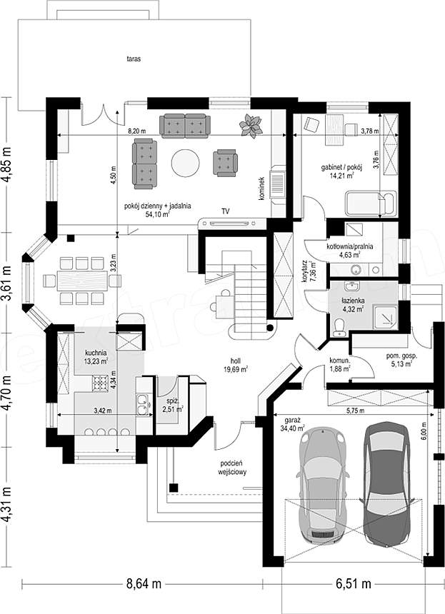 Projekt domu Hornówek 2 to wersja wariantowa projektu Hornówek. Przestronny i wygodny dom z dwustanowiskowym garażem wbudowanym w bryłę budynku, zaprojektowany dla 4-5 osobowej rodziny. Dom doskonale nadaje się na wąską działkę. Zmiany, jakie wprowadzono w projekcie, w stosunku do wersji podstawowej: zaprojektowano duży wykusz w jadalni z nisko osadzonymi oknami, zlikwidowano tylnią werandę - podcień, otwierając salon bezpośrednio na ogród przez szerokie przeszklone drzwi. Pracownia dysponuje także projektem domu Hornówek 2 w odbiciu lustrzanym.