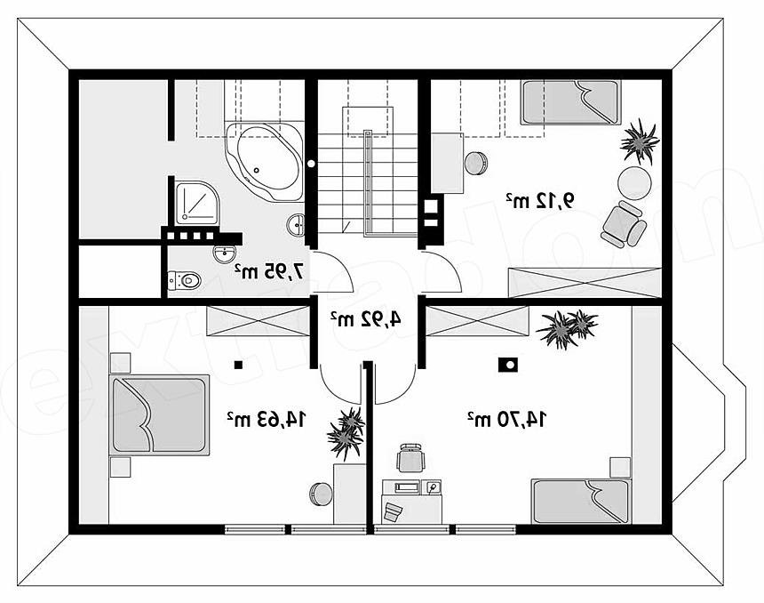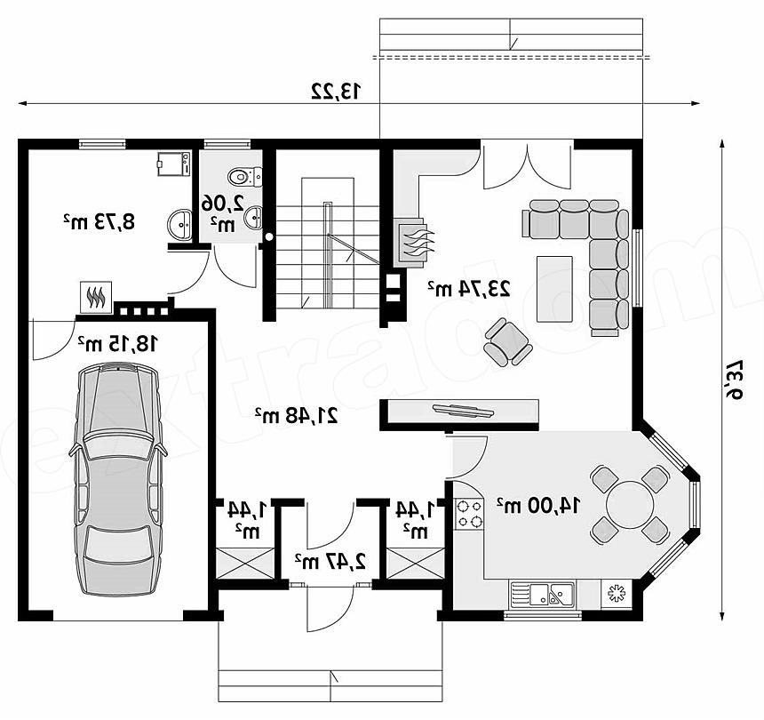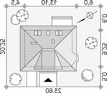Pełen uroku dom mieszkalny, jednorodzinny z użytkowym poddaszem, zaprojektowany z myślą o 4-osobowej rodzinie. Dom posiada oryginalną bryłę, czterospadowy dach oraz charakterystyczny wykusz, w którym może stanąć stół kuchenny. Projekt posiada praktyczny, przemyślany układ pomieszczeń oraz szereg wnęk mogących służyć jako szafy, schowki lub pomieszczenia gospodarcze. Na parterze znajduje się salon z kominkiem, kuchnia, wc oraz kotłownia z przejściem do garażu. Na poddaszu zaprojektowano trzy sypialnie oraz łazienkę.