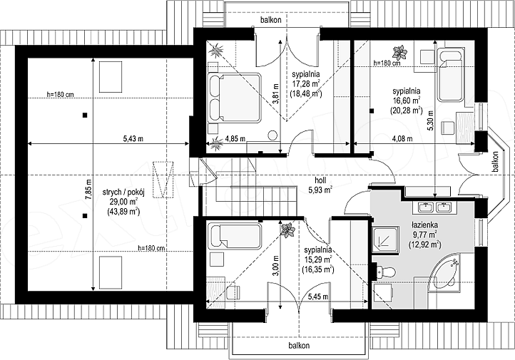Projekt domu Julka 3 to wersja wariantowa projektu Julka. Budynek o podobnym, jak w wersji podstawowej układzie wnętrz na parterze i poddaszu, ale przekryty dwuspadowymi dachami. Dzięki temu dom będzie można lokalizować na działkach, gdzie przepisy wymagają stosowania dwuspadowych dachów, a zabraniają domów z dachami wielospadowymi. Domek Julka 3, pomimo uproszczenia bryły prezentuje się bardzo atrakcyjnie. W powstałych bocznych szczytach umieszczone zostały dodatkowe okna i balkonik nad wykuszem jadalni. Frontowa i tylna lukarna z balkonami upiększają pozostałe elewacje. Wbudowany w bryłę domu podcień ogrodowy pozwala na korzystanie z tarasu w deszczowe dni. We wnętrzu nadal panuje pierwotny - jak w Julce - podział na przestrzeń dzienną na parterze, z salonem, jadalnią, holem z wyeksponowanymi schodami i częściowo otwartą kuchnią, oraz na sypialnie na poddaszu. W tej wersji projektu sypialnie i łazienka mogą być trochę większe, ponieważ przy dwuspadowym dachu odeszła część "skosów". Również strych nad garażem jest większy i teraz można go z powodzeniem zaadaptować na dwa dodatkowe pokoje. Projekt domu Julka 3 dostępny jest także w odbiciu lustrzanym w wersji bazowej ( projekt domu Julka ), w nieco mniejszej wersji ( projekt domu Julka 2 ), tańsza w reaizacji ( projekt domu Julka 4 ).