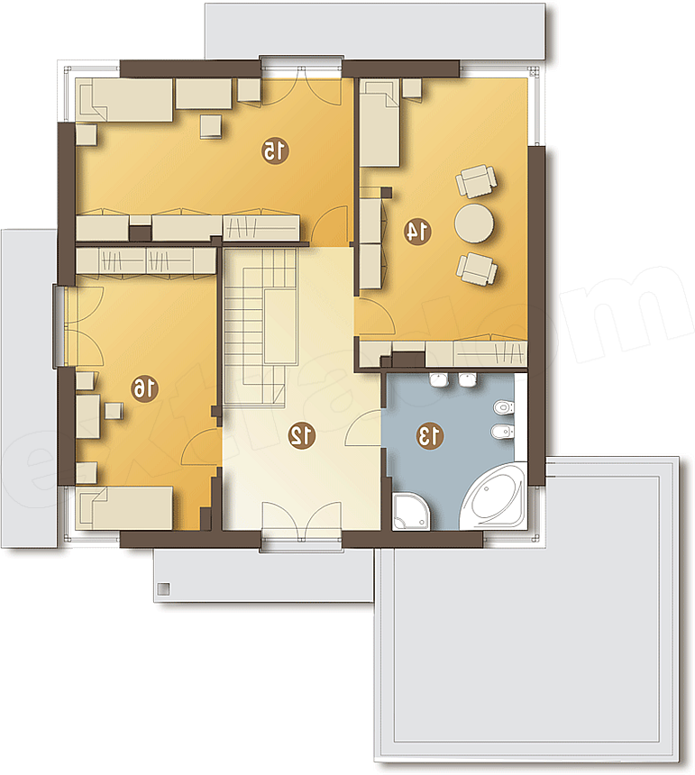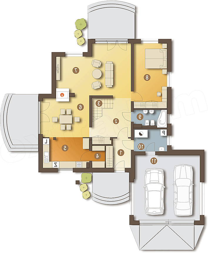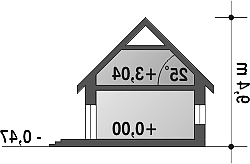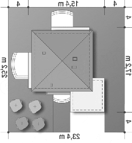 Kastor II to duży, wygodny i nowoczesny, piętrowy dom dla 4 lub 5-cio osobowej rodziny. Na parterze zaprojektowano obszerny salon z kominkiem dwustronnym otwartym również do dużej jadalni. Z jadani i salonu zaproponowano wyjścia na zewnętrzne tarasy. Pokój gościnny można z powodzeniem przeznaczyć na gabinet, lub dodatkową sypialnię. Na parterze obok dużej kuchni zaproponowano w projekcie użytkową spiżarnię. Pomieszczenie gospodarcze z piecem C.O. spełnia równocześnie funkcję przejścia do dwustanowiskowego garażu. Ze względu na wygodę przyszłych mieszkańców zaprojektowano dwie duże łazienki - na każdej kondygnacji po jednej. Na piętro prowadzą wygodne schody umiejscowione w centralnej części domu. Tu znajdują się trzy wygodne sypialnie. Piętro tak zaprojektowano, aby zminimalizować skosy i zapewnić dużą przestrzeń użytkową.