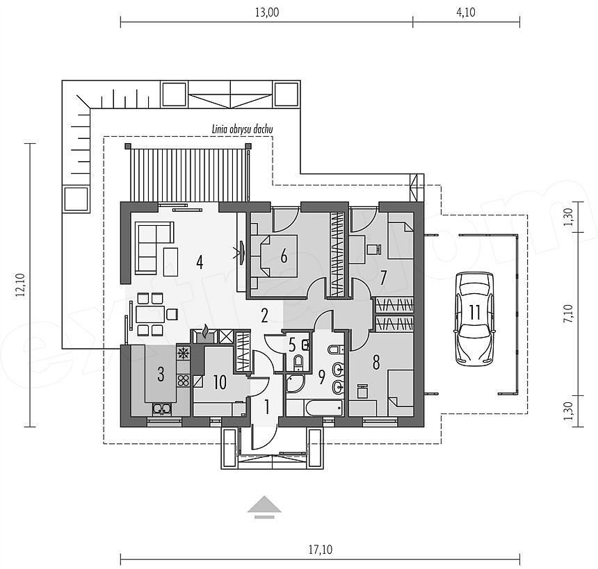 Kornel VI (z wiatą) ENERGO to dom, który do każdego krajobrazu wprowadzi powiew świeżości i nowoczesnej elegancji. Prosty, ale jednocześnie stylowy i intrygujący, z wnętrzem, w którym rządzi funkcjonalna wygoda. Dużym atutem projektu jest otwarty charakter strefy dziennej, który integruje domowników wokół wspólnych zajęć i zaprasza do odpoczynku w towarzystwie ognistych refleksów kominka. Atrakcyjną częścią domu jest również kameralny taras, który letnią porą staję się ulubionym miejscem spotkań całej rodziny.
