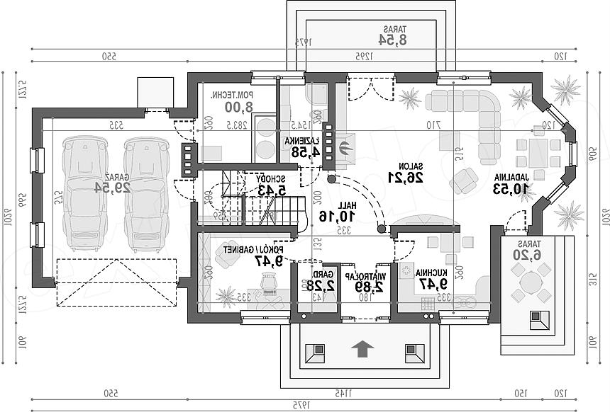 Koszałek 2G to projekt domu w stylu dworku polskiego. Cechą charakterystyczną tego projektu są masywne kolumny, na których wsparty jest balkon nad wejściem do domu oraz zadaszenie nad jednym z dwóch tarasów. Ozdobą domu są trójkątne lukarny – w jednej usytuowany jest balkon. Garaż dwustanowiskowy posiada dodatkowe wejście z tyłu domu. Dom jest bardzo przestronny. Na parterze zaplanowano duży salon z jadalnią wkomponowaną w trapezowym wykuszu. Oprócz standardowych pomieszczeń, parter obejmuje także gabinet i pomieszczenie techniczne. Dzięki powiększeniu garażu powierzchnia poddasza uległa zmianie – zwiększono jedną z sypialni. Projekt przeznaczony dla rodziny wieloosobowej.