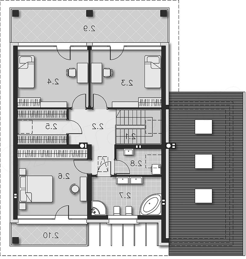 Oryginalny projekt z asymetrycznym dachem i nietuzinkowymi przeszkleniami dla lubiących nietypowe, ale praktyczne rozwiązania. Dom przeznaczony dla 4-osobowej rodziny. Na parterze znajduje się strefa dzienna: Przestronny salon z kominkiem i wyjściem na częściowo zadaszony taras, duża i wygodna kuchnia, idealna na rodzinne posiłki, łazienka, gabinet oraz przestrzeń gospodarcza, w której skład wchodzi garaż i kotłownia z bezpośrednim wyjściem na zewnątrz. Na piętrze, w strefie nocnej znajdują się trzy wygodne sypialnie, z których każda posiada wyjście na balkon, pojemna garderoba, duża komfortowa łazienka, a także oddzielna pralnia. Do dyspozycji jest również strych.
