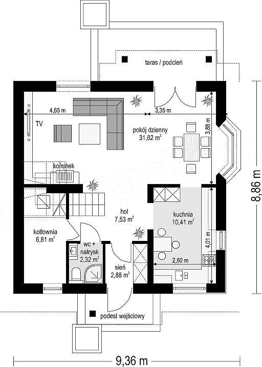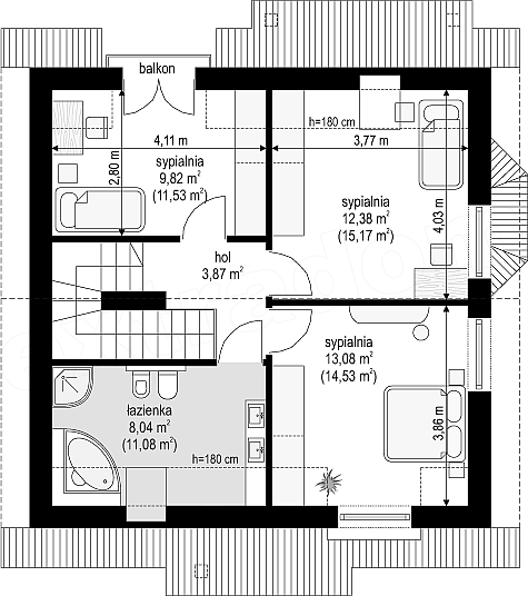 Projekt domu Michałek to śliczny domek jednorodzinny – zrealizowany jako „braciszek” projektu „ Michalina ” - oba domy mają podobną wielkość i rozplanowanie wnętrza , różną się kształtem dachu). Michałek został zaprojektowany jako wygodny dom dla czteroosobowej rodziny - jest parterowy z poddaszem użytkowym. Na parterze przewidziano obszerną część dzienną, z salonem, aneksem jadalnym, ładną – częściowo otwartą kuchnią, holem i dużą kotłownią. Na poddaszu mieszczą się trzy sypialnie i wygodna łazienka. Tradycyjna bryła budynku, zbudowana na planie kwadratu, została przekryta dwuspadowym dachem, z lukarnami. Elewację frontową urozmaica zadaszenie nad wejściem, wsparte na kolumnie i zastrzale. Elewację ogrodową ozdabiają: lukarna z balkonikiem i zadaszenie tarasu podparte kolumnami. Architektura domu jest spokojna i skromna, jednocześnie zachowane zostały właściwe proporcje bryły. Projekt domu Michałek to doskonała propozycja dla Inwestorów szukających niedużego, wygodnego domu dla swojej rodziny, biorących pod uwagę oszczędność kosztów, prostotę budowy i niewielki koszt utrzymania domu. Pracownia posiada wersję odbicia lustrzanego projektu.