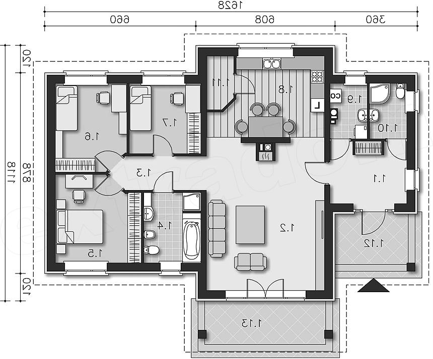 Przestronny i funkcjonalny dom dla 4 osobowej rodziny. Architektura dzięki urokliwym zadaszeniom nad tarasami i wyważonej bryle łatwo wpisze się w zastałe otoczenie. Bryła wzbogacona została przeszkleniami, nadającymi jej nieco nowoczesności. Z dobrze doświetlonego wiatrołapu dostać możemy się do łazienki z prysznicem, kotłowni z pralnią i do strefy dziennej domu. Salon z dużymi przeszkleniami i ciekawo zaaranżowanym miejscem na kominek oraz kuchnia z jadalnią tworzy jedną harmonijną całość. Dalej mamy strefę nocna, do której należą trzy sypialnie i łazienka. Dodatkowym atutem domu LMB45 jest spiżarnia przy kuchni.