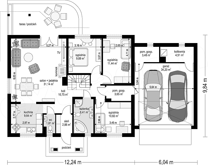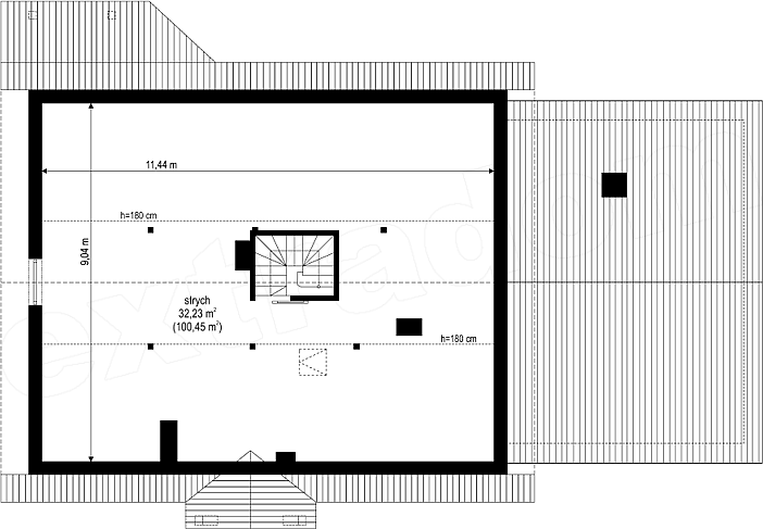 Projekt domu Niezapominajka z garażem 2 to wariant popularnego projektu Niezapominajka – tym razem z podwójnym garażem i obszerną częścią gospodarczą. Dom jednorodzinny, parterowy, przeznaczony dla cztero- pięcioosobowej rodziny. Prostokątna bryła budynku z dobudowanym garażem została przekryta dwuspadowymi dachami. Nieużytkowy strych nad parterem można zaadaptować na poddasze. Architektonicznie dom nawiązuje do typowej tradycyjnej stylistyki. Front domu z zaakcentowanym gankiem wejściowym wspartym na dwóch kolumnach z oknami po bokach, przypomina polski dworek. Wnętrze domu podzielono na część dzienną, z salonem, holem i częściowo otwartą kuchnią, oraz część nocną z trzema sypialniami i łazienką. Zaletą tej wersji projektu jest kotłownia przeniesiona do pomieszczenia za garażem, dzięki czamu dom można ogrzewać gazem, ale też zamiennie paliwem stałym. Dom Niezapominajka z garażem 2 stanowi świetną propozycję dla inwestorów chcących niedrogo wybudować dom, którzy planują zostawić sobie możliwość wykończenia w drugim etapie dodatkowej przestrzeni na strychu – lub po prostu mieć duży przydatny przecież strych. Pracownia posiada wersję odbicia lustrzanego projektu.