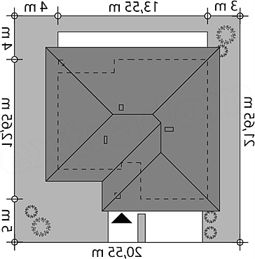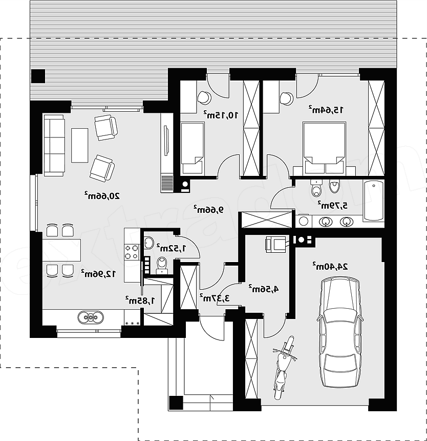 Nieduży jednorodzinny budynek mieszkalny, parterowy, z jednostanowiskowym garażem. Funkcjonany układ pomieszczeń zapewnia optymalny komfort 3-osobowej rodzinie. Ergonomicznie zaprojektowana przestrzeń została wyraźnie podzielona na część dzienną, nocną i gospodarczą. Część reprezentacyjna domu, to przestronny salon połączony z jadalnią, który otwiera się na duży, zadaszony taras oraz kuchnia ze spiżarnią. Oprócz części dziennej, przewidziano strefę intymną domu, która składa się z dwóch sypialni i łazienki. Kotłownię oraz garaż zaprojektowano w części gospodarczej domu. Ciekawie zaprojektowaną wnękę w garażu można wykorzystać jako skład opału bądź pomieszczenie gospodarcze. Geometria rzutu oraz prostota bryły czynią ten dom tanim i prostym w budowie oraz niedrogim w utrzymaniu i eksploatacji.