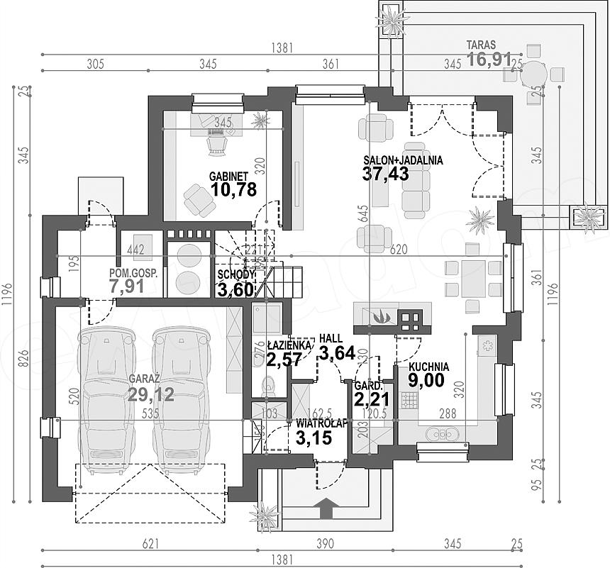 Projekt Opałek II N 2G to nowa wersja jednego z najbardziej lubianych projektów – tradycyjnego Opałka w wersji dwugarażowej. Projekt cechuje się przede wszystkim nowoczesną stylistyką. Zmieniono w nim kolorystykę, niektóre detale budynku oraz elementy wykończenia, układ okien i pokrycie dachu. Kierując się Państwa wcześniejszymi sugestiami, wewnątrz budynku został powiększony salon poprzez zabudowanie podcienia oraz WC – teraz mamy do dyspozycji funkcjonalną łazienkę. Podobnie jak w wersji tradycyjnej przednią część domu zajmuje wiatrołap, łazienka, garderoba oraz kuchnia. Duży hol prowadzi do salonu połączonego z jadalnią. W nowej wersji Opałka salon ma foremny, prostokątny kształt. W tylnej części domu usytuowany jest jeden pokój idealnie pasujący na gabinet. Na poddasze prowadzą ozdobne, ażurowe schody. Strefę nocną tworzą trzy sypialnie i łazienka o zwiększonej powierzchni. Duża sypialnia została zaprojektowana z myślą o jak najlepszym komforcie jej użytkowników – prowadzą z niej wejścia do oddzielnej łazienki i garderoby. Być może zainteresuje Państwa wersja poddasza z sypialniami przewidzianymi dla 5-osobowej rodziny – zobacz rzuty poddasza OPCJA – CZTERY POKOJE (dokumentacja projektowa zawiera obie wersje poddasza). Zachęcamy Państwa do zapoznania się z artykułem, w którym autor projektu Opałek II N 2g, mgr inż. Krzysztof Tomasz Markiewicz opisuje cały proces powstawania projektu Opałek.