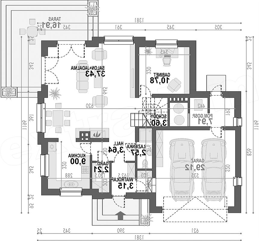 Projekt Opałek II N 2G to nowa wersja jednego z najbardziej lubianych projektów – tradycyjnego Opałka w wersji dwugarażowej. Projekt cechuje się przede wszystkim nowoczesną stylistyką. Zmieniono w nim kolorystykę, niektóre detale budynku oraz elementy wykończenia, układ okien i pokrycie dachu. Kierując się Państwa wcześniejszymi sugestiami, wewnątrz budynku został powiększony salon poprzez zabudowanie podcienia oraz WC – teraz mamy do dyspozycji funkcjonalną łazienkę. Podobnie jak w wersji tradycyjnej przednią część domu zajmuje wiatrołap, łazienka, garderoba oraz kuchnia. Duży hol prowadzi do salonu połączonego z jadalnią. W nowej wersji Opałka salon ma foremny, prostokątny kształt. W tylnej części domu usytuowany jest jeden pokój idealnie pasujący na gabinet. Na poddasze prowadzą ozdobne, ażurowe schody. Strefę nocną tworzą trzy sypialnie i łazienka o zwiększonej powierzchni. Duża sypialnia została zaprojektowana z myślą o jak najlepszym komforcie jej użytkowników – prowadzą z niej wejścia do oddzielnej łazienki i garderoby. Być może zainteresuje Państwa wersja poddasza z sypialniami przewidzianymi dla 5-osobowej rodziny – zobacz rzuty poddasza OPCJA – CZTERY POKOJE (dokumentacja projektowa zawiera obie wersje poddasza). Zachęcamy Państwa do zapoznania się z artykułem, w którym autor projektu Opałek II N 2g, mgr inż. Krzysztof Tomasz Markiewicz opisuje cały proces powstawania projektu Opałek.