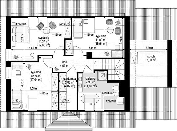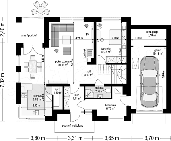Projekt domu Optymalny 2 jest wersją wariantową Optymalnego, z dobudowanym do elewacji bocznej garażem jednostanowiskowym. Budynek jest parterowy z poddaszem użytkowym, zaprojektowany na planie prostokąta, przekryty dwuspadowym dachem. Prosta minimalistyczna bryła tworzy spokojną estetyczną architekturę, z nowoczesnymi detalami i materiałami. Elewacje zostały ciekawie urozmaicone: frontowa - podcieniem wejściowym zaakcentowanym dwuspadowym daszkiem, oraz narożnym oknem kuchni; ogrodowa - ładnymi przeszkleniami salonu, oraz narożnym podcieniem osłaniającym część tarasu. Domek, dzięki swojej bezpretensjonalności z powodzeniem wpasuje się w każde otoczenie. Wnętrze domu zaprojektowano z uwzględnieniem podziału na część dzienną na parterze i sypialnie na poddaszu. Na parterze salon, holl i kuchnia tworzą wspólną otwartą przestrzeń, w której znalazło się miejsce na aneks jadalny, kąt na meble wypoczynkowe, ścianę TV i kominek. Wygodne schody, nieco oddzielone od salonu są jednocześnie ozdobą wnętrza. Na parterze przewidzieliśmy miejsce na spiżarnię przy kuchni, dodatkowy pokój ( gabinet lub sypialnię gościnną ), łazienkę i kotłownię, która w funkcjonalny sposób łączy przedsionek z garażem. Kotłownia gazowa, może być łatwo przystosowana do pieca na paliwo stałe. Garaż ma dodatkowe pomieszczenie gospodarcze. Na poddaszu umieszczono trzy wygodne sypialnie z szafami wbudowanymi, garderobę i przestronną łazienkę z oknami połaciowymi nad wanną. Projekt domu Optymalny 2 jest energooszczędny - zastosowano w nim bardzo dobre izolacje termiczne, oraz nowoczesne instalacje i technologie. Sama budowa domu, dzięki nieskomplikowanej konstrukcji, będzie łatwa i niedroga. Późniejsza eksploatacja budynku również będzie tania. Optymalny 2 to dom optymalny :-), w sam raz dla Inwestorów myślących praktycznie, oszczędnie, oraz lubiących nowoczesność osadzoną w tradycyjnej formie.