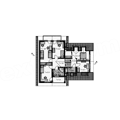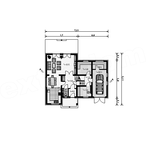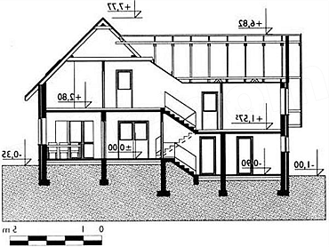 Układ funkcjonalny:Dom zaprojektowany z poziomami przesuniętymi o pół kondygnacji. Na najniższej dostępnej z poziomu terenu znajduje się garaż i pomieszczenia gospodarcze. Na kondygnacji głównej- pół piętra wyżej- zlokalizowano pokój dzienny, kuchnię, jadalnię i w.c. Na następnych półpiętrach znajdują się sypialnie i łazienki. Wszystkie poziomy łączy wewnętrzna klatka schodowa. Wykończenie:Pokrycie dachu: dachówka ceramiczna Elewacja: tynk cienkowarstwowy Cechy charakterystyczne:Przestrzenny, funkcjonalny dom średniej wielkości. Dach o kącie nachylenia połaci 45°. Wprowadzenie pośredniego poziomu mieszkalnego umożliwia usytuowanie części gospodarczej na poziomie terenu lub w niewielkim zagłębieniu i minimalizację powierzchni komunikacyjnej.