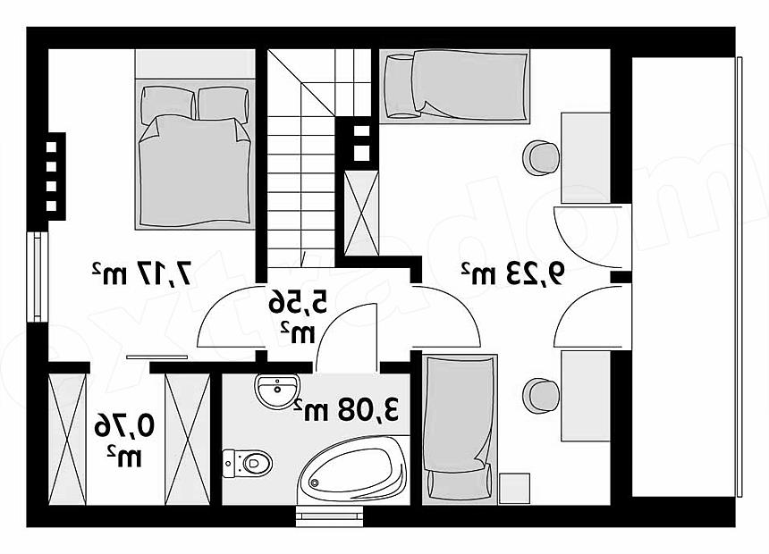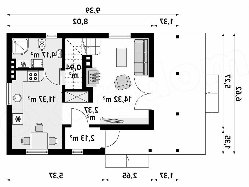 Mały, funkcjonalny dom jednorodzinny z użytkowym poddaszem o prostej, tradycyjnej bryle. Wyraźny podział funkcjonalny na część dzienną (parter) i nocną (poddasze). Na parterze zlokalizowano pokój dzienny z kominkiem i przyległym zadaszonym tarasem, kuchnię z jadalnią i łazienkę. Na poddaszu znajdują się dwie sypialnie, łazienka i garderoba.