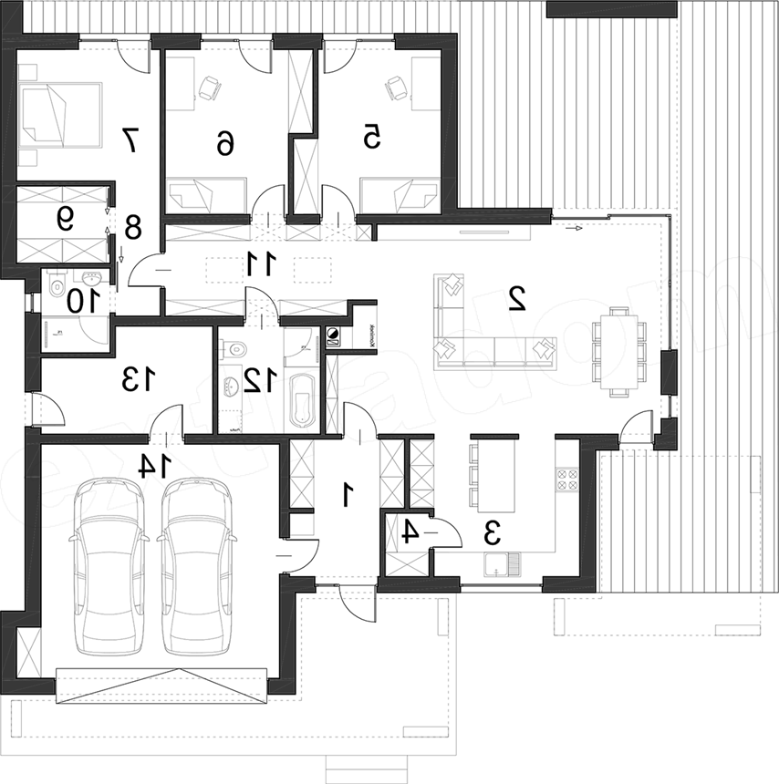 Cieszymy się, że możemy Ci zaprezentować efekt naszych ostatnich prac w postaci gotowego projektu domu o oryginalnej bryle. Dom ten wyłamuje się z ugrzecznionego schematu typowych „parterówek”. Swoją nowoczesną formą przykuwa oko a układ wnętrz zapewnia świetną funkcjonalność. Od pewnego czasu nosiliśmy się z zamiarem zaprojektowania modnie prezentującego się domu parterowego. Miał to być budynek oryginalny, o asymetrycznej bryle, i jednocześnie nienachalnym, i nie za bardzo udziwnionym wyglądzie. Na początku projektowania postanowiliśmy wyjść od kilku połączonych ze sobą prostokątów. Zdecydowaliśmy wspólnie, że będą się odróżniać od siebie wielkością, kolorystyką i rozwiązaniami materiałowymi, lecz mimo to, stworzą po połączeniu naprawdę ładny i kompaktowy dom parterowy, którym zainteresują się osoby lubiące odważną ale też funkcjonalną architekturę w jednym. Jeśli chodzi o układ funkcjonalny wnętrz, chcieliśmy by dom, jako że jest rozłożysty, dawał poczucie dużej przestrzeni. Spotęgowaliśmy je ponadto znacznych rozmiarów przeszkleniami, i to nie tylko w salonie, jak ma to zwykle miejsce w większości projektów, lecz także w dwóch pokojach i sypialni, które wyposażyliśmy w oddzielne wyjścia na taras. Będzie to rozwiązanie wygodne pod względem komunikacyjnym i bardzo efektowne wizualnie – tak od zewnątrz, jak i od środka, patrząc z perspektywy każdego z pomieszczeń (szczególnie latem). Oczywiście nie zapomnieliśmy również o garderobie przy sypialni małżeńskiej, w której jest oddzielna łazienka z prysznicem, ale i o sporej spiżarni na zakupy oraz rzadziej używane sprzęty kuchenne, itp. Zarówno w kuchni, jak i w wiatrołapie zaplanowaliśmy dużo miejsca na przechowywanie w postaci trzech wnęk – jednej na wysokie szafki kuchenne, dwóch bardzo obszernych, na szafy do przechowywania odzieży wierzchniej i obuwia. Zwróć też uwagę na sporej wielkości pomieszczenie techniczne. Nie ograniczaliśmy celowo jego powierzchni z myślą o zainstalowaniu w nim pralki, suszarki i zlewu pralniczego. Takie rozwiązanie jest wygodne ale i nie zabiera miejsca w łazience, którą można dzięki temu zaaranżować jako zakątek do relaksu i wypoczynku. Dlaczego nie urządzić w niej niewielkiego, lecz własnego i przytulnego spa?.. Co do salonu połączonego z jadalnią, to jest on bardzo przestronny i ustawny. Posiada wygodne ciągi komunikacyjne – nie kolidują z meblami i obszernym wyjściem na drewniany taras. W bezpośrednim sąsiedztwie znajduje się kuchnia z wyodrębnionym kontuarem typu wyspa, odsłoniętym od salonu ścianą. W efekcie, miejsce to jest bardziej intymne a do kuchni prowadzą dwa wejścia, które nie tylko wyglądają oryginalnie ale też ułatwiają dostęp do pomieszczenia. Mamy nadzieję, że gotowy projekt domu Przejrzysty D27 wzbudzi Twoje zainteresowanie. Jeśli chcesz dowiedzieć się więcej na jego temat, jak zwykle chętnie odpowiemy na Twoje pytania telefonicznie lub przez e-mail. Zachęcamy Cię serdecznie do nawiązania z nami kontaktu.
