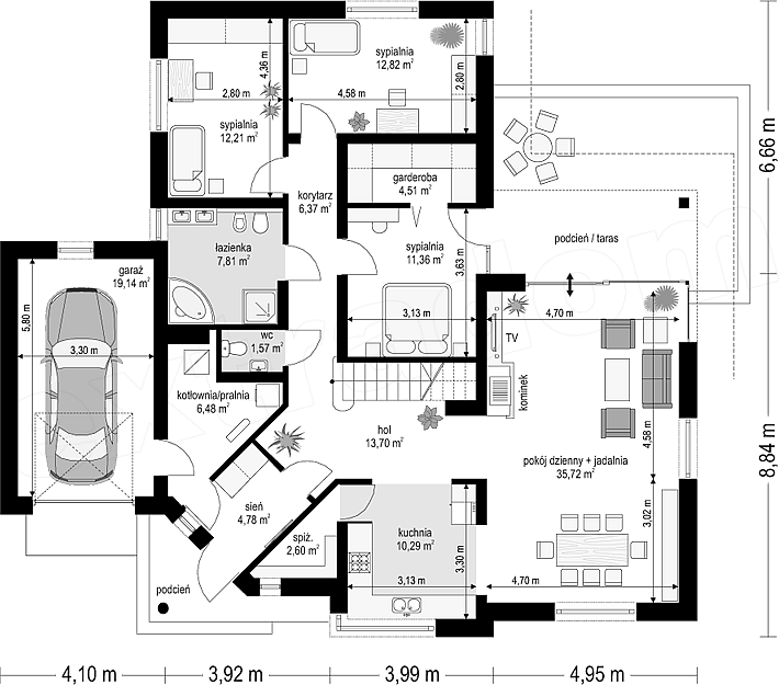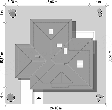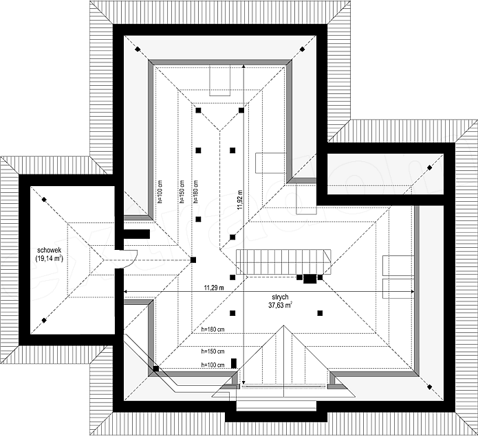 Projekt domu Rozwojowy to propozycja pracowni na nowoczesny, parterowy domek dla cztero-pięcioosobowej rodziny. Projekt Rozwojowy zbudowany jest na planie litery L, z dobudowanym garażem. Cały program funkcjonalny domu znajduje się na parterze, a dodatkowo powyżej zaprojektowano duży strych, który można zaadaptować na poddasze użytkowe. Koncepcja Rozwojowego, to możliwość powiększania wnętrza domu o dodatkową przestrzeń po latach mieszkania - bez dużej komplikacji. Dom rośnie wraz z rodziną, z dorastającymi dziećmi, potrzebującymi więcej miejsca. Wnętrze budynku składa się z trzech oddzielnych części: dziennej - z salonem, nocnej - z sypialniami, oraz gospodarczej - z garażem i kotłownią. Część dzienna to obszerny salon, z wyeksponowanym kominkiem i piękną, przeszkloną ścianą - otwarciem na częściowo zadaszony taras i ogród, półotwarta kuchnia, oraz hol ze schodami. Część sypialna natomiast, to: trzy sypialnie z łazienką - w tym sypialnia rodziców z garderobą i wyjściem na taras. Spora przestrzeń techniczno-gospodarcza składa się z: dużej kotłowni, garażu i spiżarni dostępnej z kuchni. Architektura zewnętrzna projektu Rozwojowy to połączenie klasycznej formy wielospadowego, symetrycznego dachu, z nowoczesną linią ścian i otworów okiennych - z narożnymi oknami, wykuszami, fragmentami ścian obłożonymi drewnem. Całość tworzy urozmaiconą niemonotonną całość, z dobrymi proporcjami i zachowaną ludzką skalą budynku. Dom idealnie wpasuje się w otaczającą działkę, dając domownikom niepowtarzalną przyjemność bycia blisko przyrody.