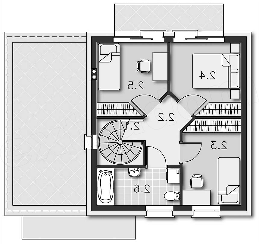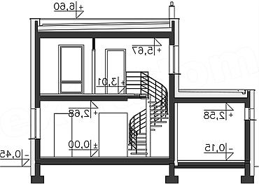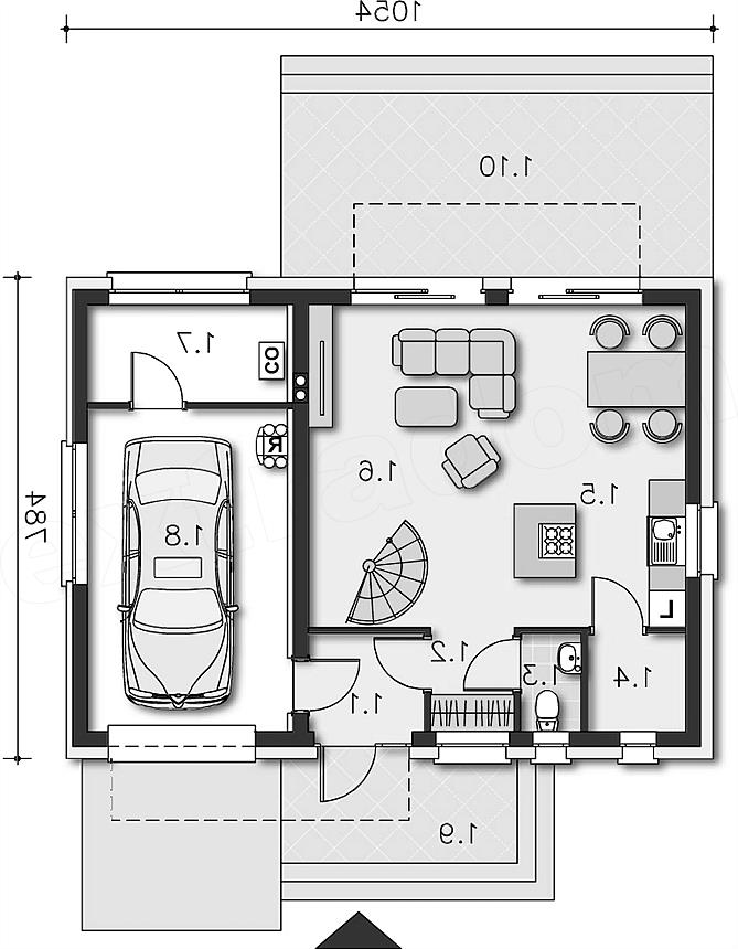 Funkcjonalny i nowoczesny dom jednorodzinny z płaskim dachem, przewidziany w standardzie energooszczędnym, idealny dla niewielkiej rodziny. Parter w całości przeznaczono na jedną część wspólną, do której należy kuchnia, jadalnia i salon z przeszklonym wyjściem na taras. Kręcone schody dodają pomieszczeniu uroku i prowadzą na drugą kondygnację, gdzie znajdują się trzy sypialnie i łazienka. W zwartą, prostą bryłę domu wpisano garaż na jedno auto, za którym znajduje się kotłownia.