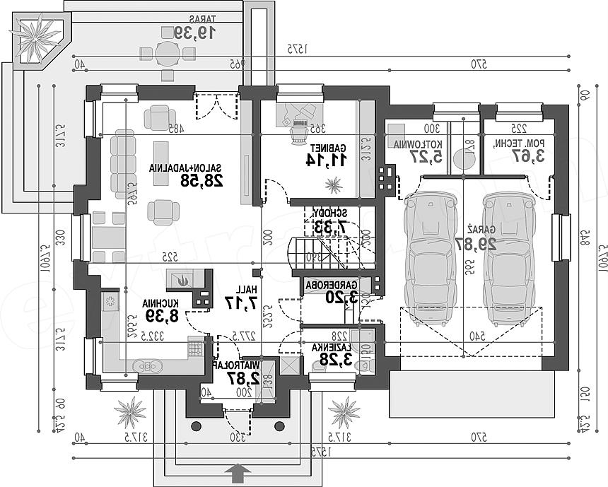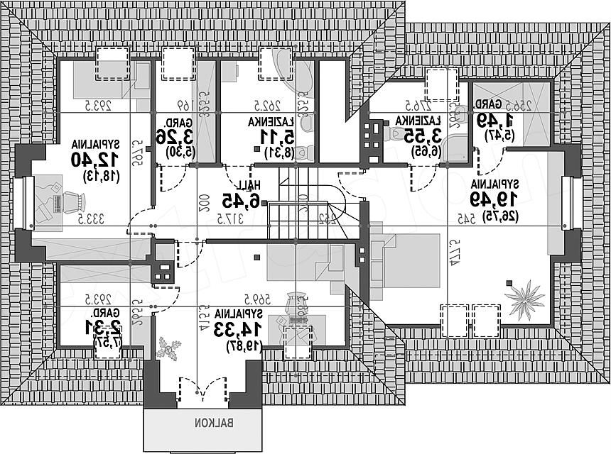Jest to wersja stylowego, klasycznego domu Rumcajs N z podwójnym garażem. Zastosowanie większego garażu korzystnie wpłynęło na powierzchnię użytkową i funkcjonalność pokoju nad garażem – ma on teraz o 6,5 m? większą powierzchnię użytkową i dwa dodatkowe pomieszczenia: garderobę i przestronną łazienkę. Taki układ pokoju powoduje, że jest to idealne miejsce na sypialnię rodziców. Pozostałe pokoje na poddaszu są bardzo przestronne, dzięki czemu można w różny sposób aranżować ich wystrój, co w małych przestrzeniach jest mocno ograniczone. Dwie garderoby – w tym jedna ogólnodostępna – również podnoszą komfort użytkowania. Rozplanowanie wszystkich pomieszczeń – zarówno na parterze jak i na poddaszu – jest tak zaprojektowane, by zmninimalizować przestrzenie komunikacyjne na rzecz powierzchni użytkowych. Niewątpliwą zaletą parteru jest dodatkowy pokój w tylnej części domu idealnie pasujący na gabinet lub jako dodatkowa sypialnia dla domowników lub gości.