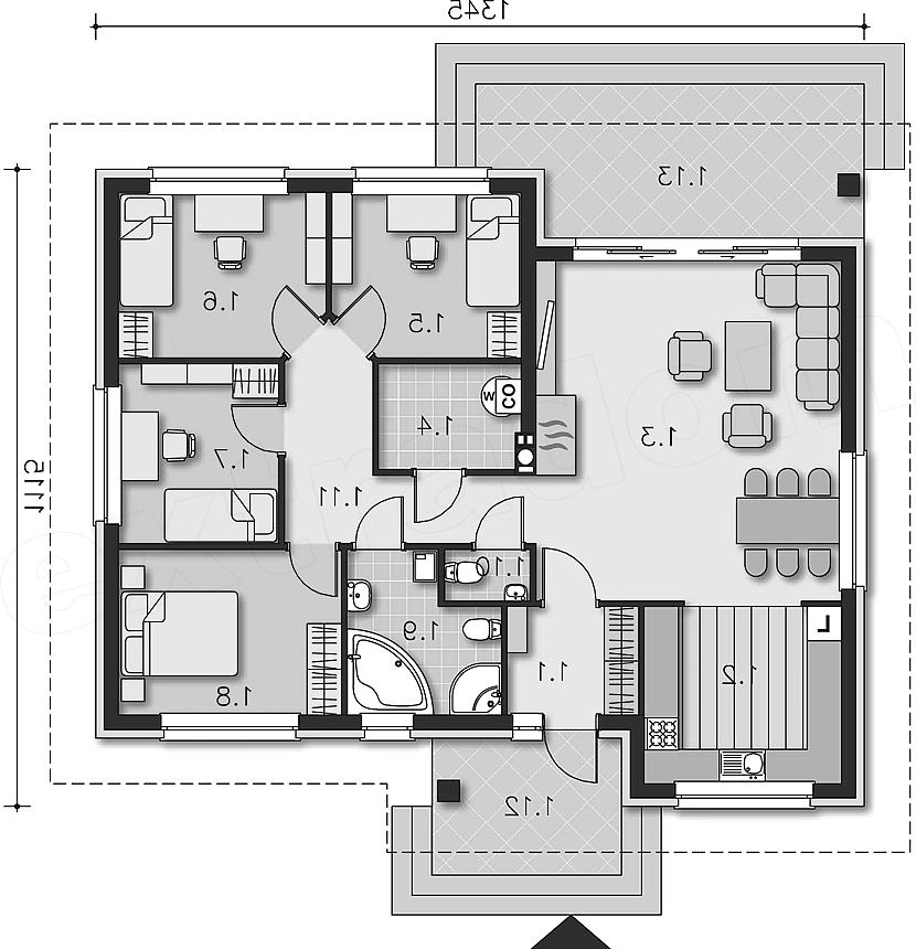 Dom parterowy o niewielkim metrażu, funkcjonalnie i wygodnie rozplanowany. Wnętrze kryje obszerny salon z kominkiem, połączony z kuchnią, cztery sypialnie, łazienkę, wc i pomieszczenie gospodarcze. Ozdobą domu jest częściowo zadaszony taras, na który można wyjść z salonu przez duże, oszklone drzwi. Saga II jest wersją domu Saga, różniącą się dachem – w tym projekcie jest on czterospadowy. Prosta, a zarazem elegancka bryła wzbogacona została drewnianymi elementami elewacji.