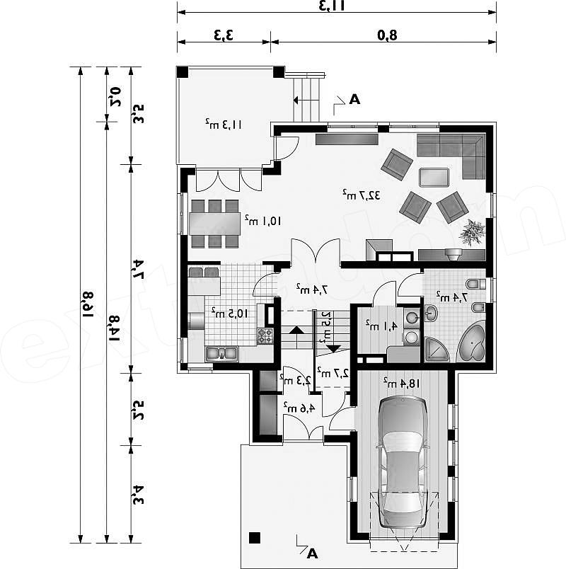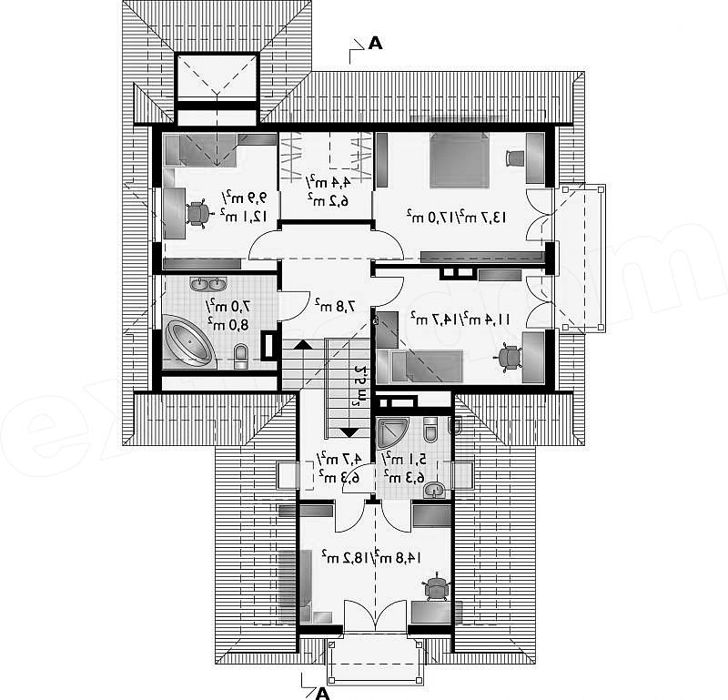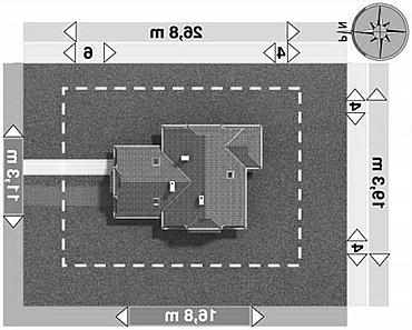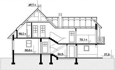 Malowniczy dom na rzucie litery "T", nakryty wielospadowym dachem o kącie nachylenia połaci 45°. Charakterystyczne elementy to arkadowy podcień wejściowy i loggia na poziomie parteru. Charakterystyczny również dach z naczółkowymi okapami.