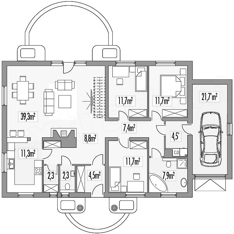 Stylowy dom w cenie mieszkania. Prosty w konstrukcji, niedrogi, przeznaczony dla 4-5-osobowej rodziny. Parterowy z ewentualnym poddaszem użytkowym. Samowystarczalny parter to strefa dzienna złożona z dużego, wygodnego pokoju dziennego z centralnie umieszczonym kominkiem oraz kuchni, a także część prywatna z trzema sypialniami, łazienką i pomieszczeniami gospodarczym (pralnią). Przez pomieszczenie gospodarcze możliwe jest przejście do ewentualnego garażu powiększonego o pomieszczenie na rowery i narzędzia ogrodowe. Poddasze można adaptować w późniejszym terminie uzyskując dwie sypialnie z łazienką. Rzut aranżowany jest głównie ścianami działowymi, dzięki czemu w łatwy sposób można go zmienić. Projekt ma warianty bez garażu oraz z garażem pojedynczym. Każda z wersji posiada opcjonalne zadaszenie nad wyjściem tarasowym dołączone do projektu. W przygotowaniu jest alternatywna opcja rzutu parteru z zabudowaną klatką schodową. Projekt będzie dostępny również w wersji z piwnicą. W razie zainteresowania prosimy o kontakt z pracownią HORYZONT. Zanim zdecydują się Państwo na wybudowanie piwnicy konieczne będzie przeprowadzenie badań gruntu i określenie wysokości wód gruntowych. Budowa piwnicy niesie za sobą dodatkowe koszty, dlatego aby je zoptymalizować należy przeprowadzić adaptację konstrukcji fundamentów i piwnicy do lokalnie panujących warunków gruntowych.