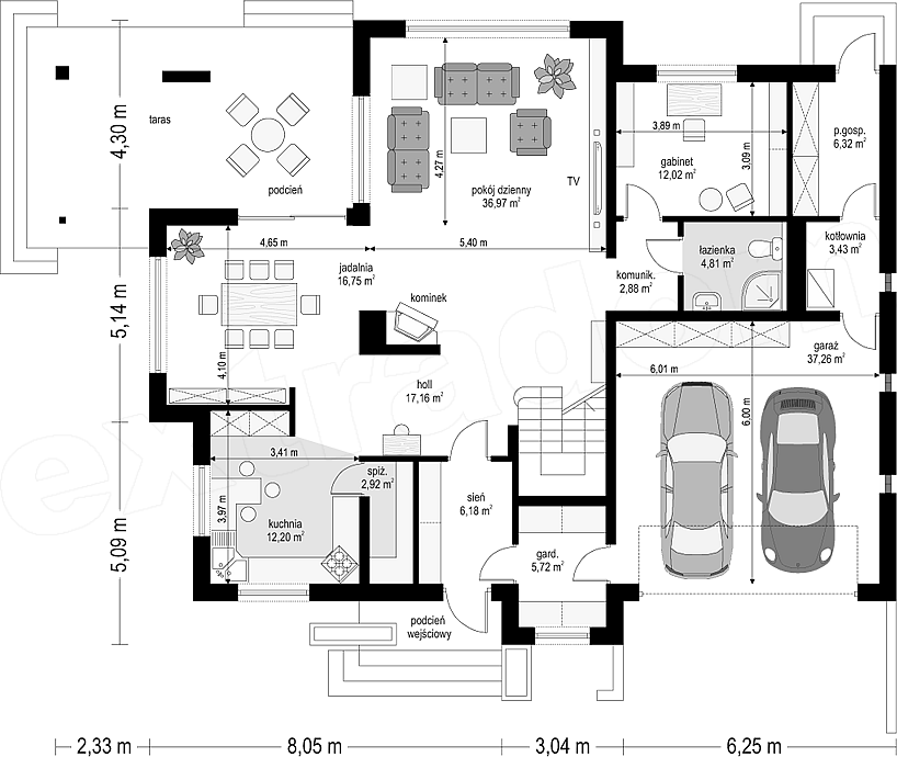 Projekt domu Słodki to uroczy, piętrowy dom dla rodziny 4-6 osobowej. Budynek powstał przez połączenie piętrowej części mieszkalnej i parterowej ze strychem bryły dobudowanego garażu. W projekcie domu Słodki to daszki, balkony, tarasy i pergole stanowią urozmaicenie oszczędnej bryły. Podział ścian domu na dwa poziome pasy obniża wizualnie piętrową sylwetkę domu. Wnętrze domu Słodki to jednoprzestrzenny parter, z salonem, jadalnią i holem. Na piętrze zaprojektowano sypialnie. Na parterze udało się wygospodarować dodatkowy pokój mogący służyć jako gabinet, lub dodatkowa sypialnia. Na parterze znajduje się również garaż i pomieszczenia techniczne. Na piętrze nad garażem powstała duża przestrzeń do dowolnej aranżacji. Szczególnie urokliwy jest w projekcie zadaszony taras z dużymi przeszkleniami z jadalni i salonu - stanowi on płynne przejście między wnętrzem a ogrodem. Pracownia posiada projekt domu Słodki w odbiciu lustrzanym.