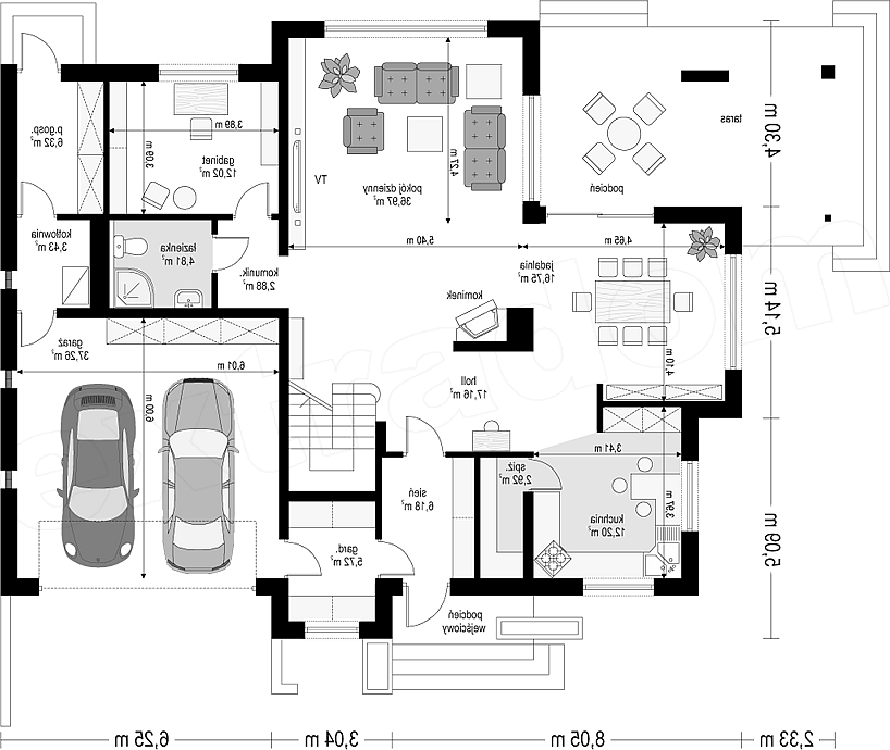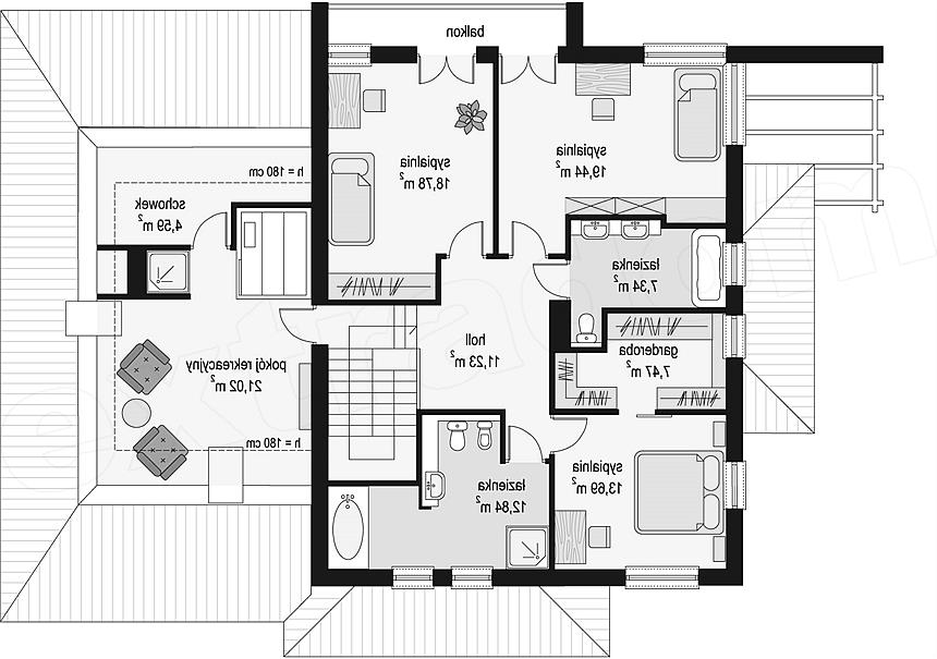 Projekt domu Słodki to uroczy, piętrowy dom dla rodziny 4-6 osobowej. Budynek powstał przez połączenie piętrowej części mieszkalnej i parterowej ze strychem bryły dobudowanego garażu. W projekcie domu Słodki to daszki, balkony, tarasy i pergole stanowią urozmaicenie oszczędnej bryły. Podział ścian domu na dwa poziome pasy obniża wizualnie piętrową sylwetkę domu. Wnętrze domu Słodki to jednoprzestrzenny parter, z salonem, jadalnią i holem. Na piętrze zaprojektowano sypialnie. Na parterze udało się wygospodarować dodatkowy pokój mogący służyć jako gabinet, lub dodatkowa sypialnia. Na parterze znajduje się również garaż i pomieszczenia techniczne. Na piętrze nad garażem powstała duża przestrzeń do dowolnej aranżacji. Szczególnie urokliwy jest w projekcie zadaszony taras z dużymi przeszkleniami z jadalni i salonu - stanowi on płynne przejście między wnętrzem a ogrodem. Pracownia posiada projekt domu Słodki w odbiciu lustrzanym.