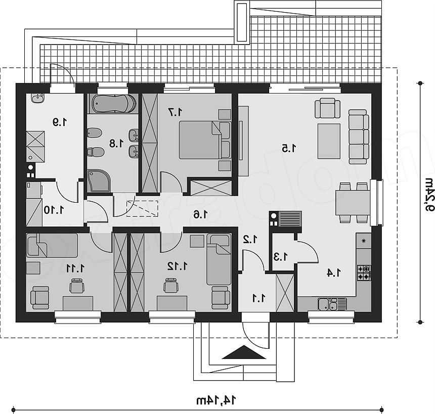 Dom parterowy przeznaczony dla 3-4 osobowej rodziny. Wnętrze budynku podzielono na 3 strefy. Strefa dzienna to przestronny, dobrze oświetlony salon, połączony z otwartą kuchnią, w sąsiedztwie której znajduje się praktyczna spiżarnia. Kuchnię, w razie potrzeby, można w łatwy sposób wydzielić, odgradzając ją ścianką od pokoju dziennego. Centralne usytuowania kominka ułatwi ogrzewanie domu zimą. Strefa nocna to 3 ustawne pokoje i łazienka, w której zmieści się wanna i prysznic. W głównej sypialni przewidziano miejsce na ciąg praktycznych szaf przesuwnych. Posiada ona także wyjście na taras. Strefę gospodarczą zaplanowano na krańcu budynku, składają się na nią: pralnia oraz duża kotłownia, z bezpośrednim wyjściem na zewnątrz. Pomieszczenia te mogą być połączone, tworząc jedno duże. W korytarzu przewidziano schody składane, umożliwiające dostęp na sporych rozmiarów strych. W domu zaprojektowano dwa rodzaje ogrzewania: GAZOWE oraz na PALIWO STAŁE. Od przyszłego inwestora zależy, które z nich wykorzysta. Dom ma prostą bryłę i nieskomplikowany dach, dzięki czemu jest tani w budowie i późniejszej eksploatacji. Budynek zaprojektowano w oparciu o najnowsze przepisy prawa budowlanego, z dużą dbałością o jego wpływ na środowisko naturalne. Uwaga! Dokumentacja Projektowa nie zawiera elementów małej architektury takich jak: donice, podesty, altany, grille ogrodowe, murki, pergole, a także innych elementów wizualizacji, takich jak: garaże i wiaty wolnostojące, drogi, podjazdy, ogrodzenia, baseny itp.