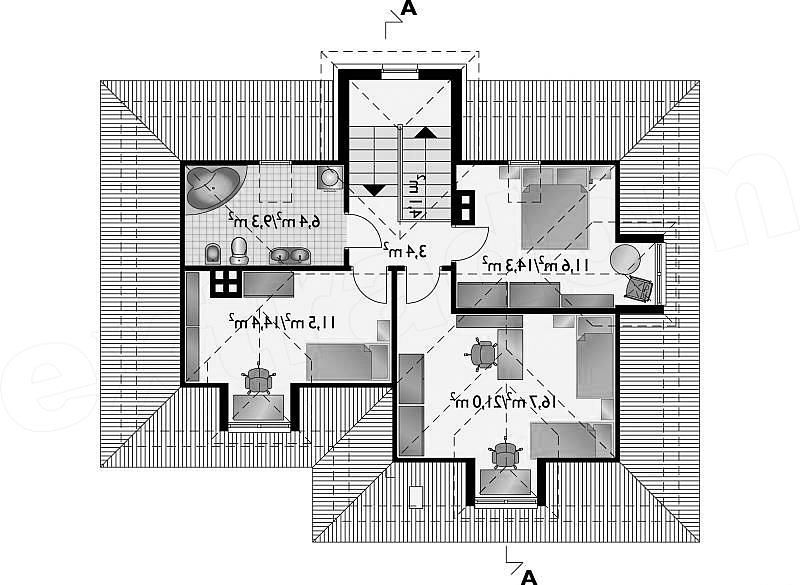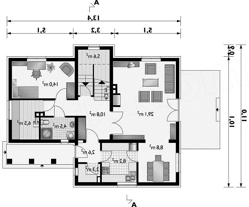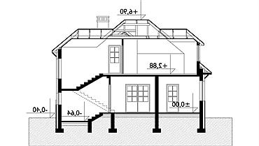 Malowniczy dom o zwartej bryle na rzucie litery "L" przykryty dachem wielospadowym o kącie nachylenia połaci 40°. Dach urozmaicają lukarny. Charakterystyczny arkadowy podcień wejściowy i obiegający dookoła gzyms nadają budynkowi niepowtarzalny urok.