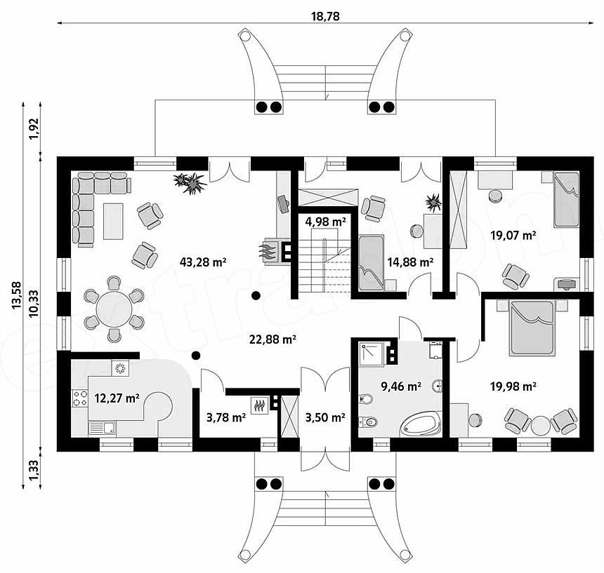 Dom parterowy z poddaszem użytkowym, przeznaczony dla 4 – 5-osobowej rodziny. Tradycyjna bryła o stylu dworkowym z dachem czterospadowym.