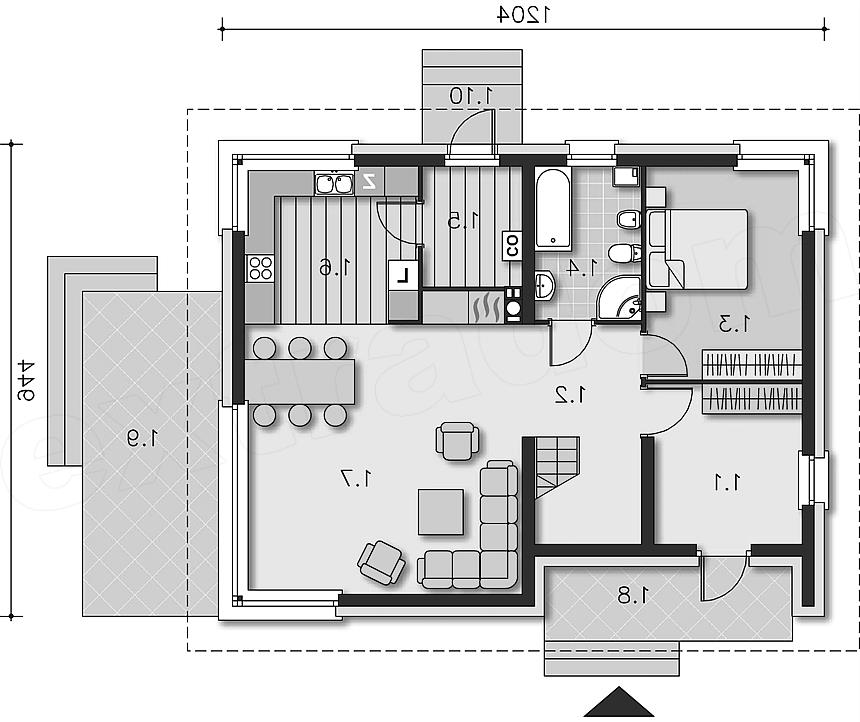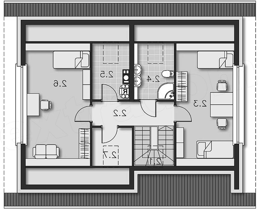 Świetny, nowoczesny projekt domu o bardzo proporcjonalnej bryle i ładnym wykończeniu, nadający się na działki z wjazdem od południa. Jest to energooszczędna wersja domu Tivoli, w którym przestawiliśmy umiejscowienie schodów. Uzyskaliśmy powiększenie salonu i bardzo wygodną strefę wejściową. Na parterze znajduje się duża sypialnia, która dzięki sąsiedztwu dużej łazienki może być da rodziców, a poddasze może być wtedy przeznaczone dla dzieci. Układ pomieszczeń na poddaszu można dostosować do własnych potrzeb, wykorzystując dodatkowe pomieszczenia na pralnię, garderoby, lub włączyć do powierzchni pokoi.