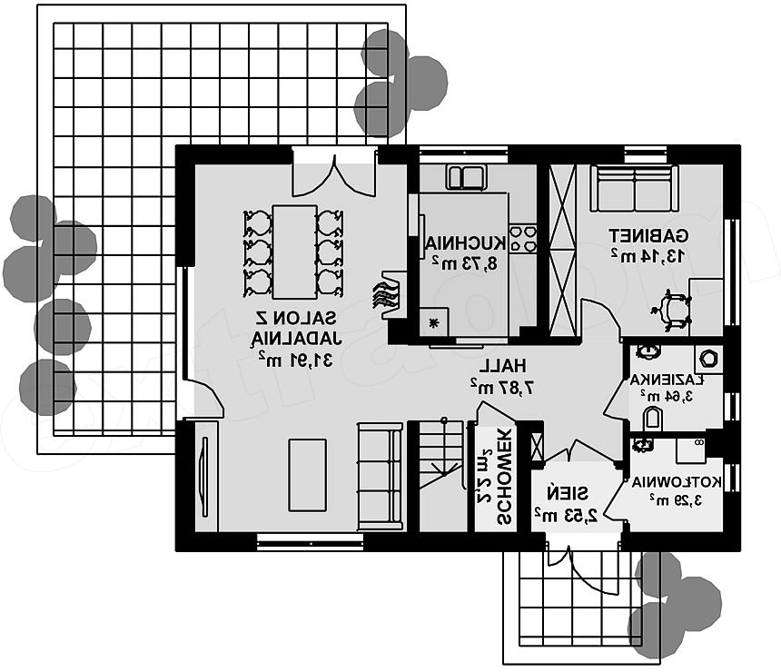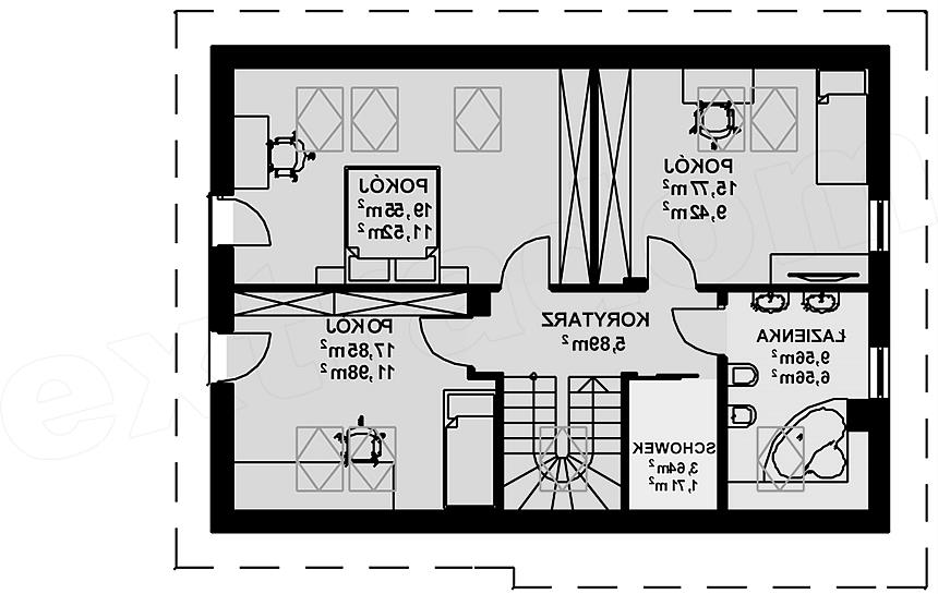 Dom sprawdzi się doskonale na działce z wjazdem od południa jak również od północy. Niezwykle funkcjonalny, dzięki pokojowi na parterze, który według potrzeb może zmienić się w gabinet lub dodatkowy pokój dla osoby starszej. Dom posiada dwa pomieszczenia pomocnicze tzw. „schowki”, które doskonale sprawdzają się np. jako garderoba. Poddasze mieści trzy sypialnie i dużą łazienkę.