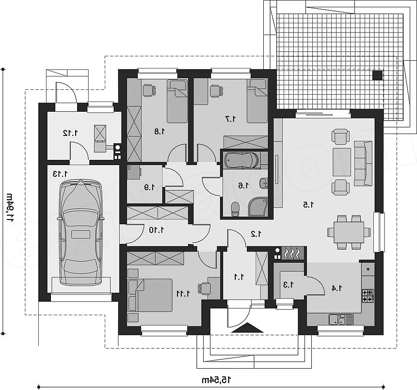 Wersja z garażem popularnego projektu TRYTON. Prosty dom parterowy z czterospadowym dachem i lekkim stropem drewnianym. Do dyspozycji mieszkańców jest duży, dobrze oświetlony salon, kuchnia z praktyczną spiżarnią, 3 ustawne pokoje, łazienka z miejscem na wannę i prysznic oraz niewielka pralnia. Przez garderobę dostaniemy się natomiast do garażu, za którym znalazła się spora kotłownia. W domu zaprojektowano 2 rodzaje ogrzewania: GAZOWE oraz na PALIWO STAŁE. Dzięki takiemu zabiegowi, projektu nie trzeba przerabiać, inwestor sam decyduje, który rodzaj ogrzewania zastosuje w swoim domu - dokumentacja zawiera schematy i rozwinięcia instalacji c.o. i elektrycznych dla obydwu rozwiązań. W korytarzu zaprojektowano schody składane prowadzące na strych. Dla przyszłych inwestorów będzie on przydatnym miejscem składowania różnych rzeczy. Dom ma prostą bryłę, dzięki czemu będzie tani w budowie i późniejszej eksploatacji. Uwaga! Dokumentacja Projektowa nie zawiera elementów małej architektury takich jak: donice, podesty, altany, grille ogrodowe, murki, pergole, a także innych elementów wizualizacji, takich jak: garaże i wiaty wolnostojące, drogi, podjazdy, ogrodzenia, baseny itp.