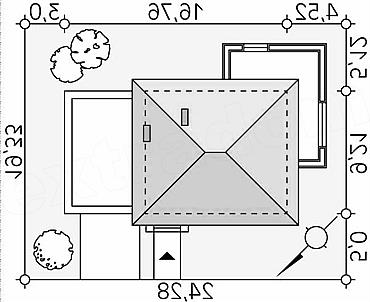 Pow. zabudowy | 153,26 m2 | Min. szer. działki | 24,28 m | Kąt nach. dachu | 20 st |